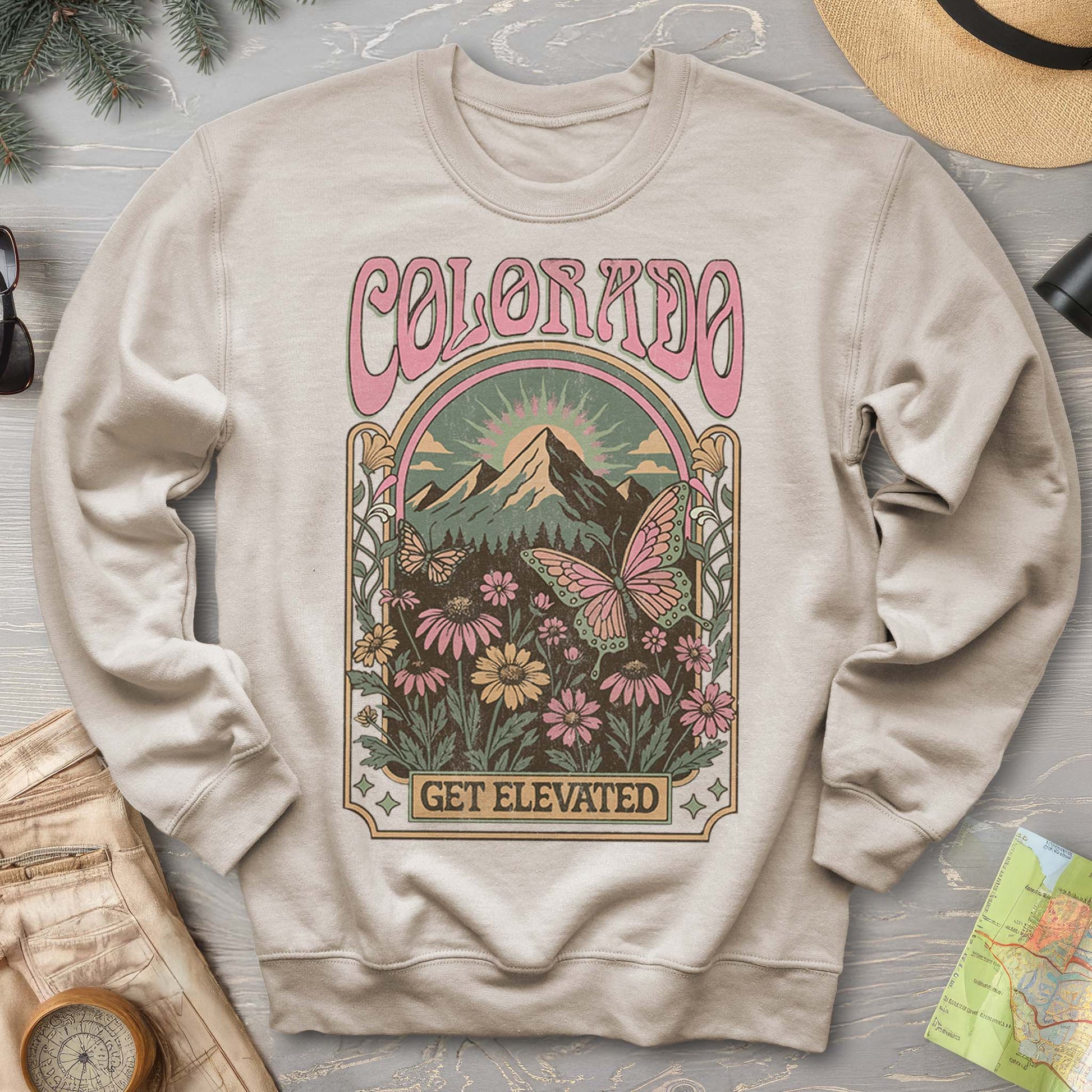 Spread your wings and embrace the mountain vibes with our Colorado Get Elevated Butterfly Sweatshirt. This playful piece combines nature-inspired design with cozy comfort, perfect for anyone who loves the outdoors and isn't afraid to show their adventurous spirit. Whether you're hiking peaks or just dreaming of elevation, this sweatshirt keeps you warm while celebrating the beauty of Colorado's wild side. Soft, stylish, and ready for your next adventure.