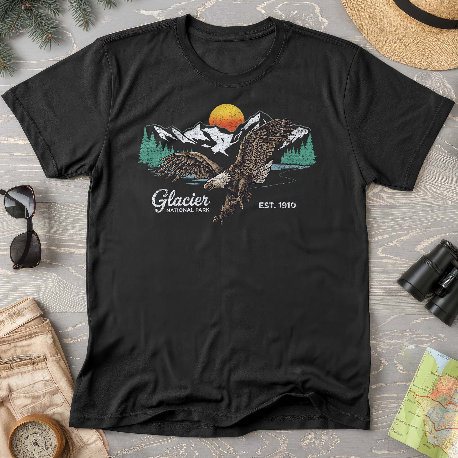 Soar through your adventures in this Comfort Colors tee celebrating Glacier National Park's majestic eagle and alpine beauty. The design captures that perfect moment where mountain peaks meet wild wildlife in nature's glory. Whether you're a park visitor or armchair adventurer, this shirt tells your love story with the great outdoors.