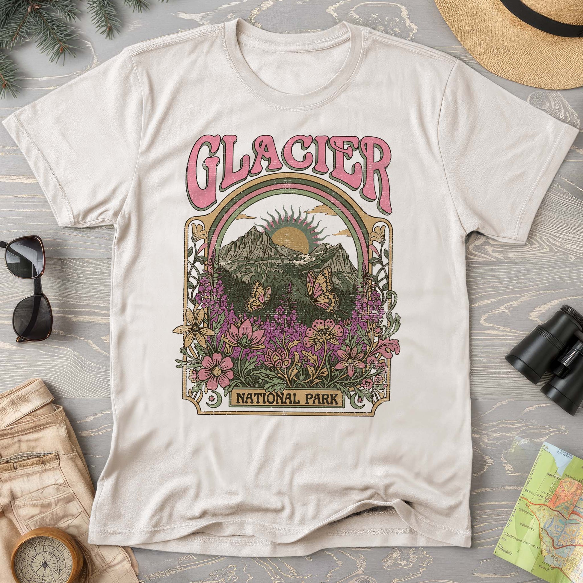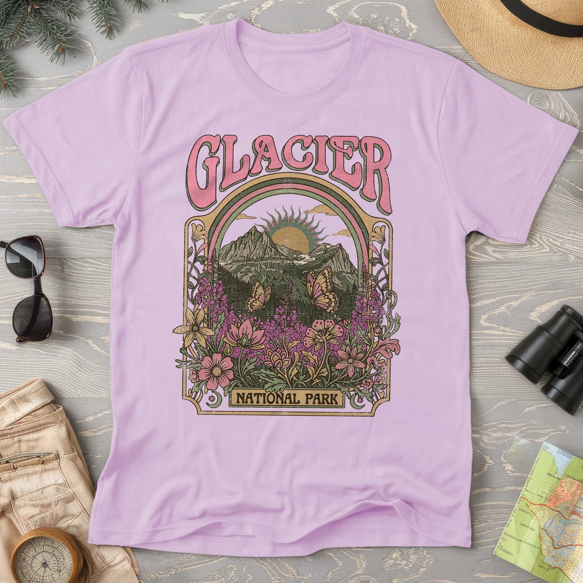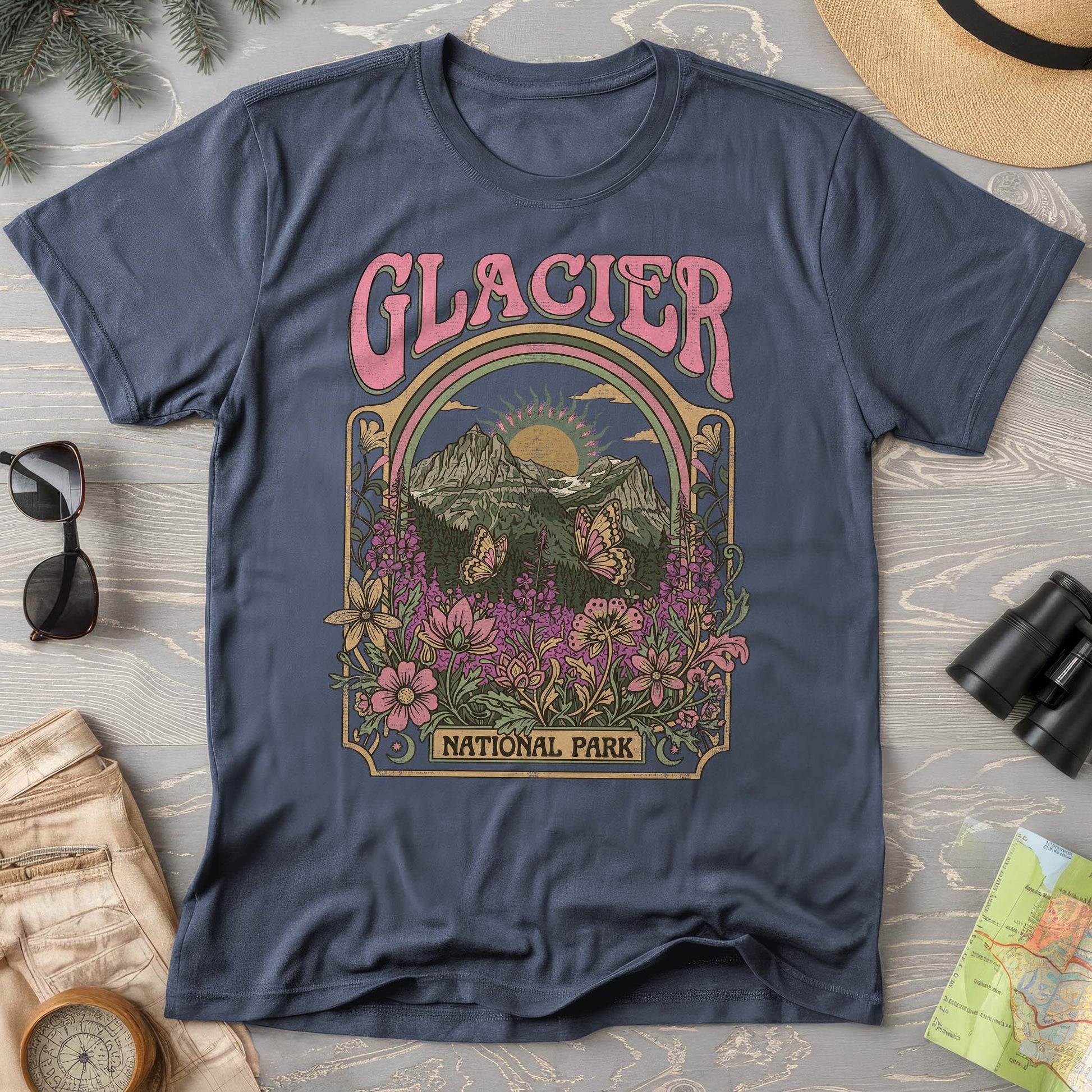 Explore the wild beauty of Glacier National Park with this dreamy Comfort Colors tee. Mountain peaks, wildflower meadows, and delicate butterflies create a vintage-inspired adventure vibe. Perfect for nature lovers who wear their wanderlust on their sleeve.