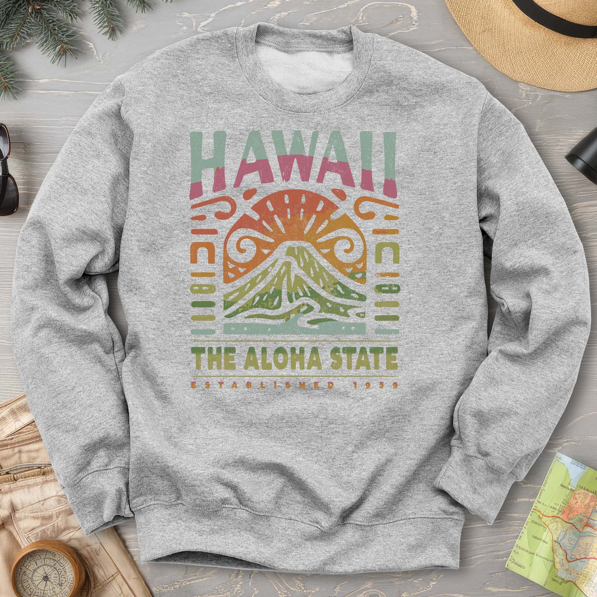 Embrace island vibes with the Hawaii The Aloha State "Volcano Tattoo" Sweatshirt! This cozy piece brings the fiery spirit of Hawaii’s volcanoes right to your wardrobe, perfect for adding a playful splash of tropical adventure to your day. Whether you're dreaming of sandy beaches or just love bold, unique designs, this sweatshirt keeps you comfy and stylish all year round. Let your outfit erupt with fun!