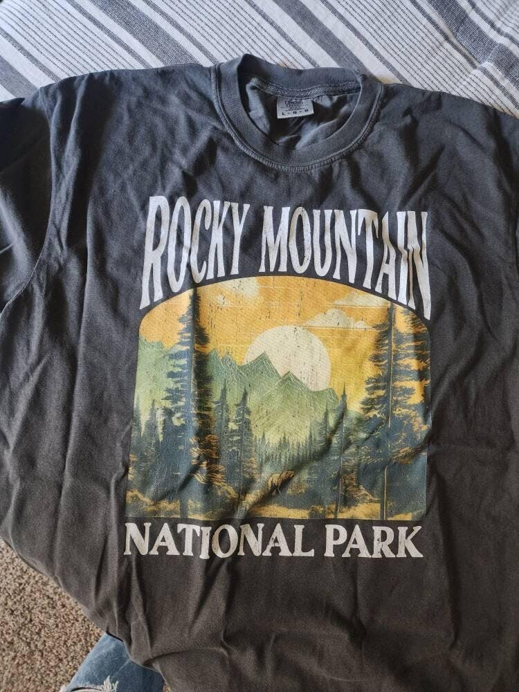 Show off your love of Colorado and our nation's beautiful Parks in our Rocky Mountain National Park Shirt! This crewneck is all about embracing the great outdoors, featuring a custom design that showcases the beauty of the Rocky Mountains with a black bear exploring his epic surroundings! The Comfort Colors 100% garment dyed cotton fabric has that comfy, lived-in feel, that's like a hug every time you put it on! Now you can take a bit of the Rockies with you wherever you wander! Grab one while you can, and hit the trail!